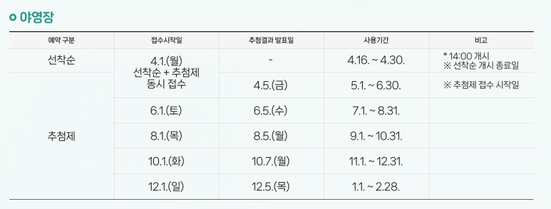 4월 말~6월까지의 캠핑장 이용 관련 추첨 접수는 4월 1일~5일까지 이며 추첨은 5일에 진행한다고 해요