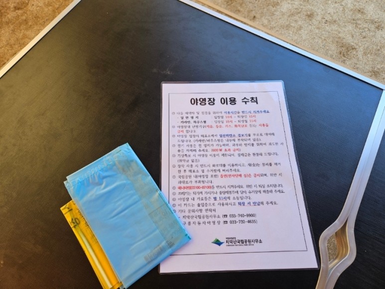 구룡야영장 입구에서 쓰레기 봉투와 음식물쓰레기 봉투 이용수칙, 일산화탄소 측정기 등 캠핑에 필요한 물건을 주신답니다